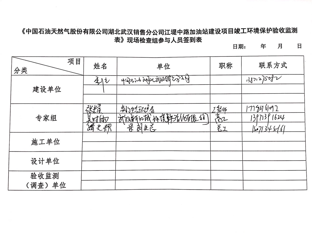 2021年1月6日,中国石油天然气股份有限公司湖北武汉销售分公司组织江堤中路加油站建设项目验收,并邀请3位专家成立验收工作组(名单附后)。